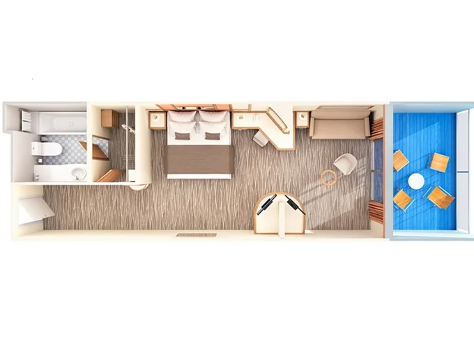 | 8B - Kajuta s balkónom 21,5 - 25,5 m² (vrátane balkóna). 10. paluba stred, vzadu; 11. paluba vpredu, vzadu. | 1 132 € 566 € za osobu | ||